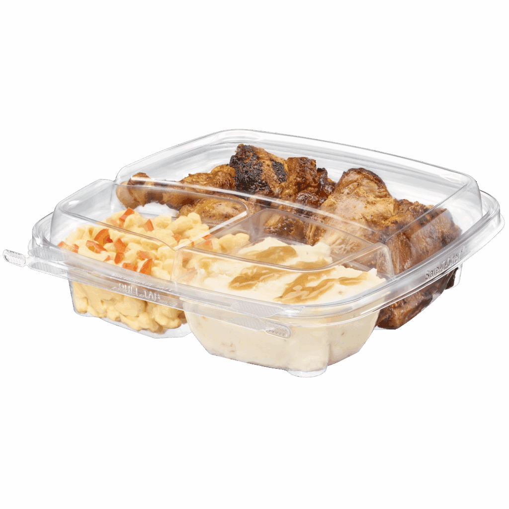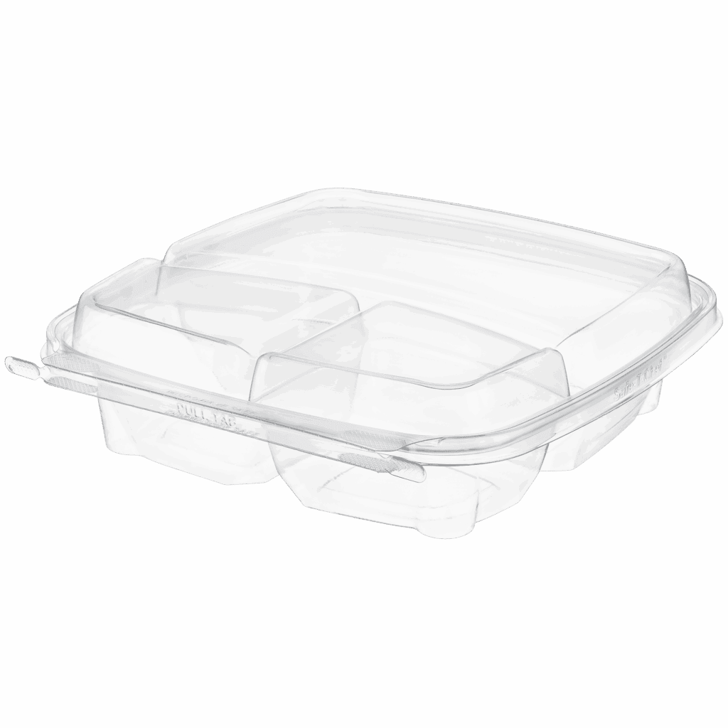 Tamper evident & tamper resistant microwaveable clamshell, 40 oz, in a square footprint, 9x9 three compartment.
