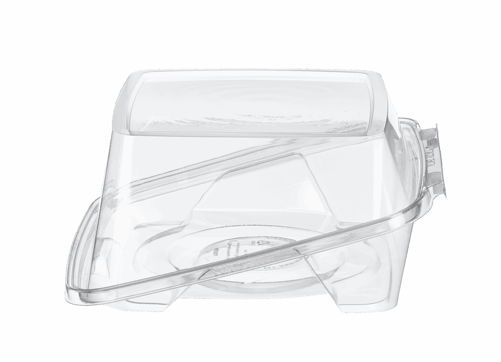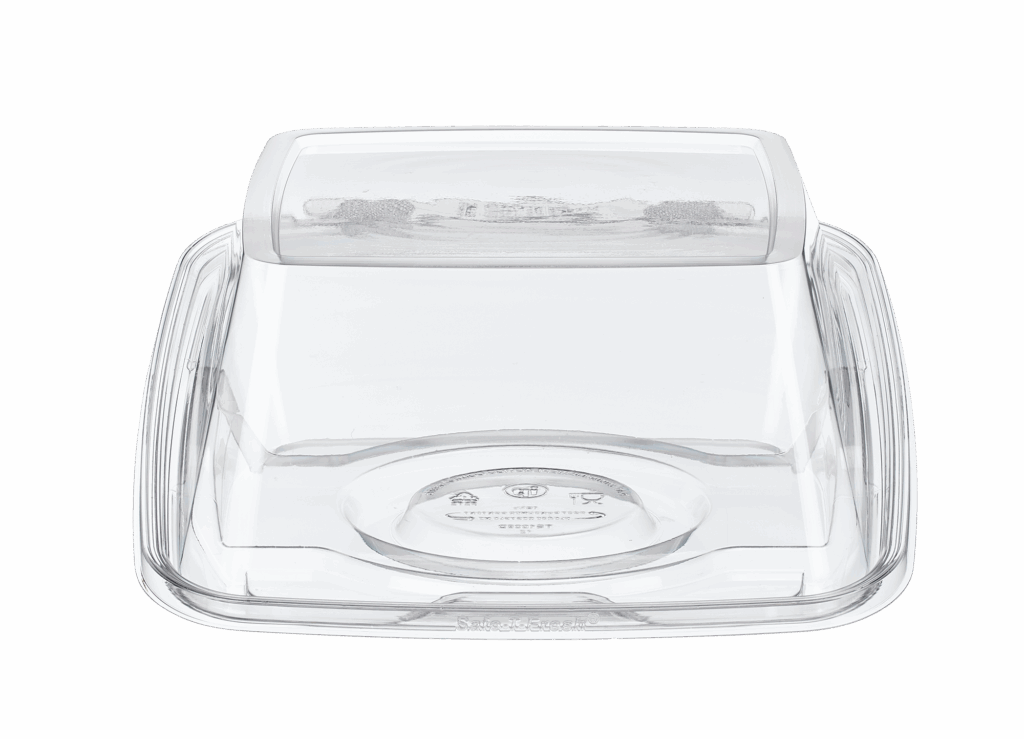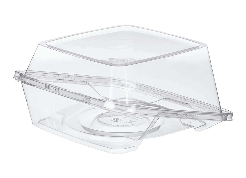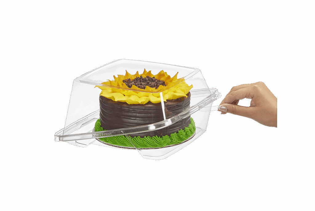 Tamper evident & tamper resistant clamshell cake, in a square 10 x 10 footprint, holds 8 inch cake board